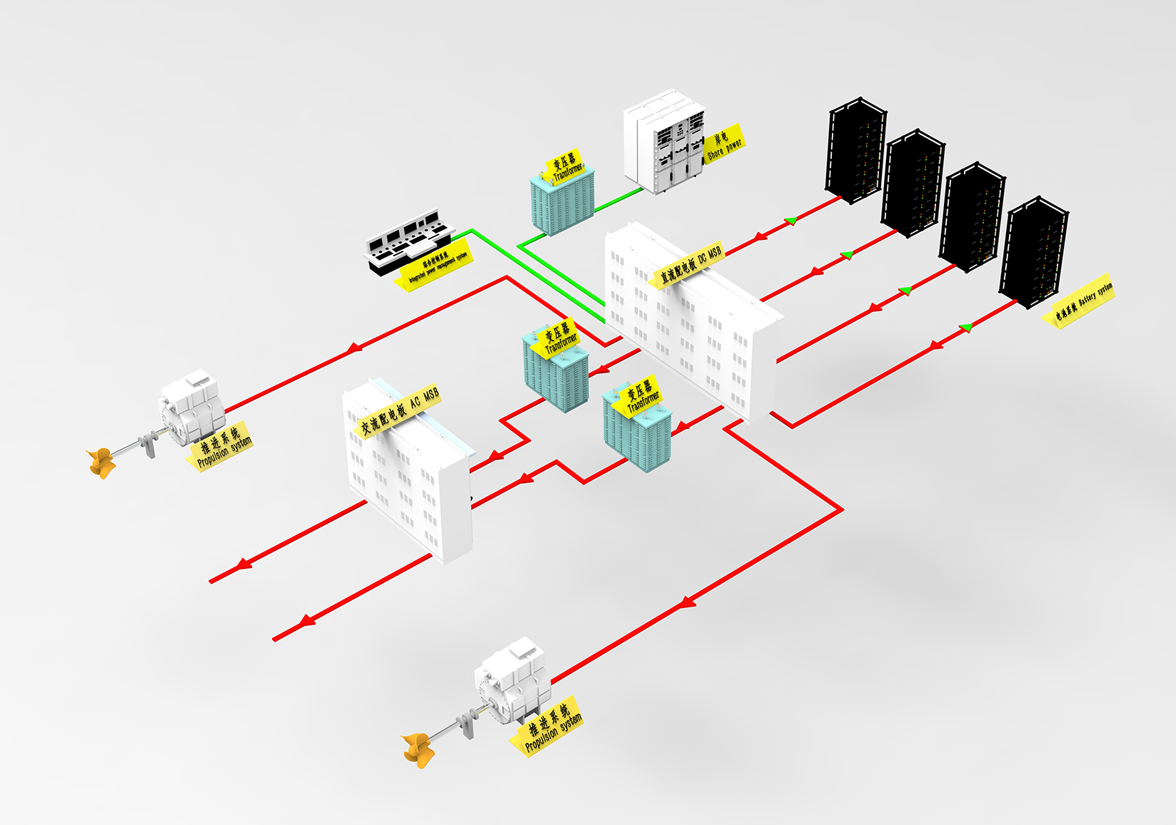 本方案由岸基电源和直流充电堆组成,充电时充电枪与船舶上的充电插座箱连接后,对船舶电池组充电,充电功率大于500kW,可同时作为岸电电源为船舶停靠时提供用电保障,适用于沿江沿海的大中型电动船,直流组网的大型混合动力船舶。